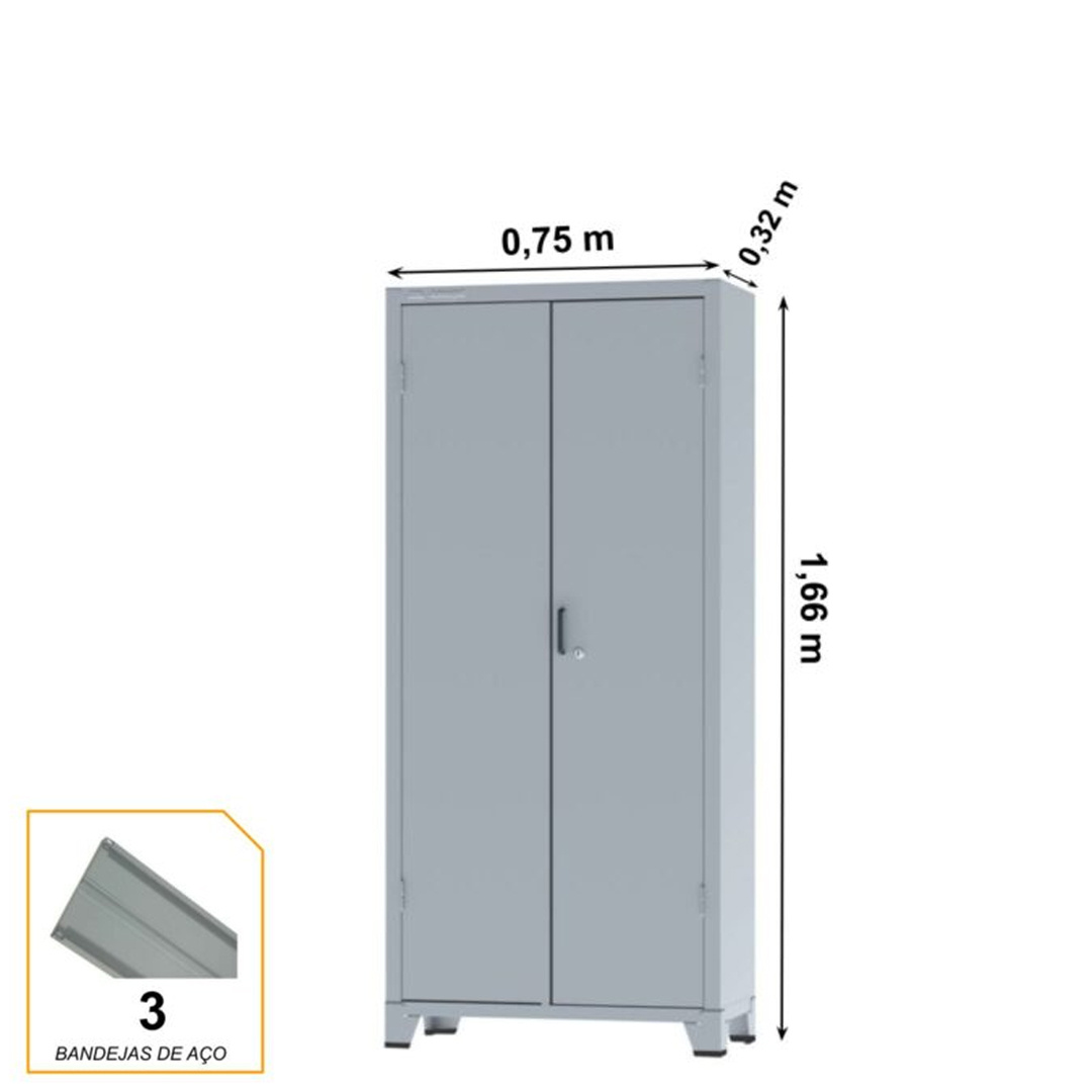Armário de Aço Cinza com 02 portas – PA 75 – 1,66×0,75×0,32m – Chapa 26 – 3101