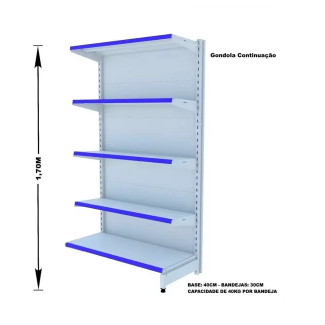 A Gôndola Premium Flex 40 Parede é ideal para supermercados, mercearias, lojas de utilidades, materiais de construção, agropecuárias e outros. Prática e fácil de montar, com sistema de encaixe sem utilização de parafusos, possui bandejas reguláveis a cada 4,5cm, pés com regulagem de altura, colunas dupladas e tratamento especial da superfície.