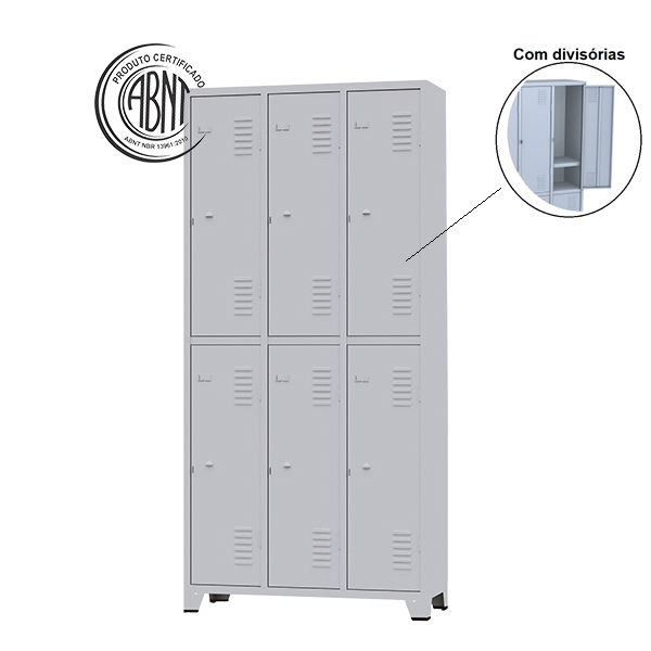 Armário Roupeiro de aço para vestiário, produzido em aço chapa 26 0,45 mm, possui 6 portas com venezianas para ventilação, compartimento de tamanho médio independentes sem divisórias internas, fechamento das portas através de pitão para cadeado.